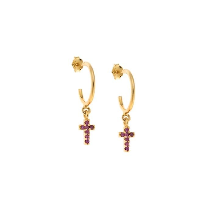 Gold plated sterling silver earrings, cross with fuchsia cubic zirconia