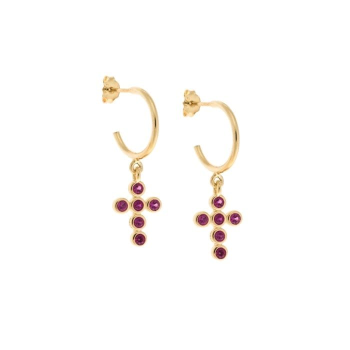 Gold plated sterling silver earrings, cross with fuchsia cubic zirconia quantity