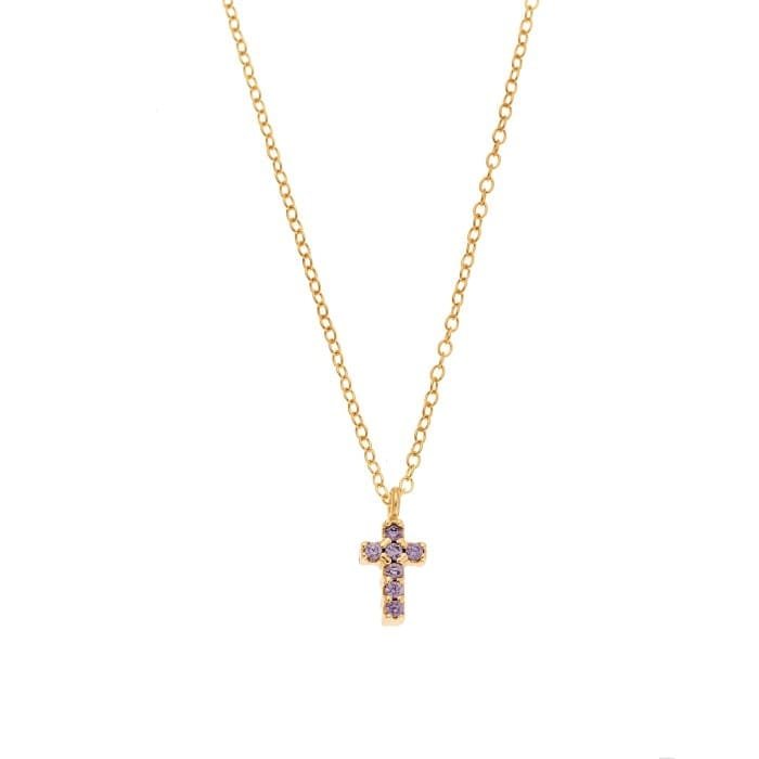 Gold plated sterling silver necklace, double sided cross necklace with purple and white cubic zirconia